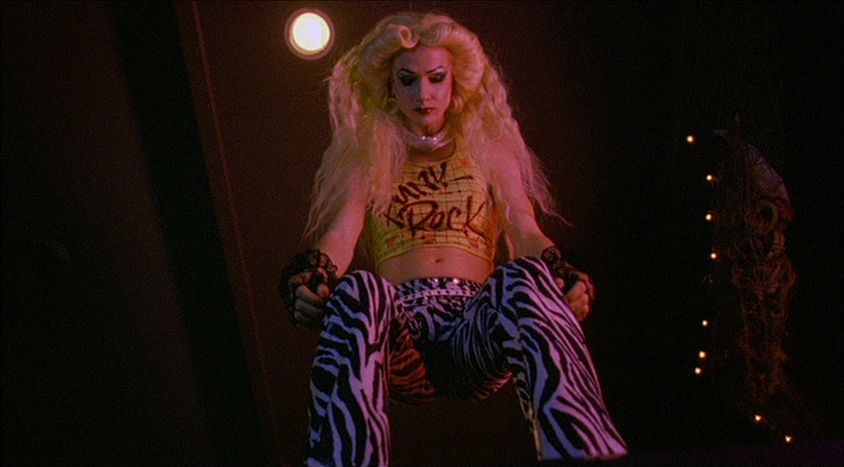 Refusing to succumb to her tragedies, Hedwig envisions a more glamorous, femme alter-ego of herself and forms a glitzy rock band she calls “The Angry Inch” as a means to take ownership over her pain. Donning a bleached Farrah Fawcett looking blonde wig (which was apparently realized after a Squeezebox Debbie Harry performance), she builds a new life for herself. A Jewish drag queen from Zagreb, Yitzhak, becomes her assistant back-up singer and husband (Miriam Shor), but their co-dependent relationship becomes unhealthy and destructive, as Hedwig develops insecurities surrounding Yitzhak’s budding talent which she fears could overshadow her own. She befriends the older brother of a child she babysits for (calling back to Hedwig’s origination from Mitchell’s life) and they quickly develop a romantic relationship. His name is Tommy Speck (Michael Pitt) is a Christian evangelist who works on songs with Hedwig, and eventually takes the stage name “Tommy Gnosis.” He expresses clear homophobia which only worsens when he discovers that she is not biologically female. His self-destructive behaviors worsen as he wrestles with his own sexual identity, and eventually he flees, going on to become a successful rock star using the songs Hedwig wrote, while her band is struggling to make ends meet.