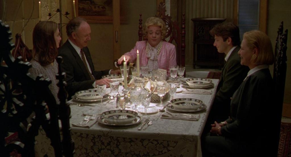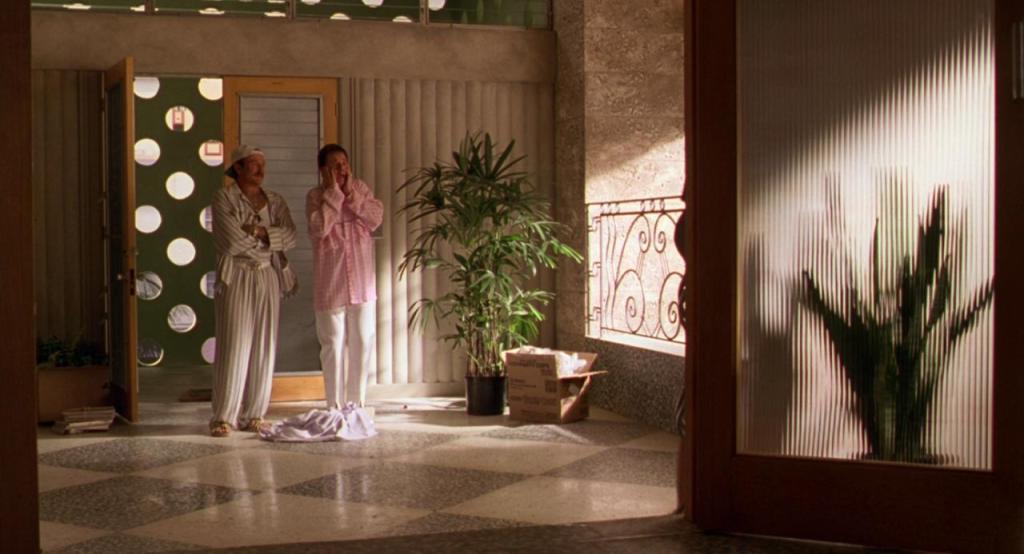 One of the most surprising aspects of this 1990’s film is that Emmanuel Lubezski is the cinematographer. Lubezski, the man who was nominated for eight Academy Award nominations for Best Cinematography, and won this category for three consecutive years, for “Gravity” (2013), “Birdman” (2014), and “The Revenant” (2015). In “Birdcage,” he approaches much more lighthearted subject matter, but his touch is still present in every scene, where simple shots feel electric and he is able to create drama with the spaces. This is especially present when shooting inside the mansion where Williams and Lane’s character abide, which is decadent with art and decor. The elevated nature of the shots are sometimes even used to add comedy to various scenes.