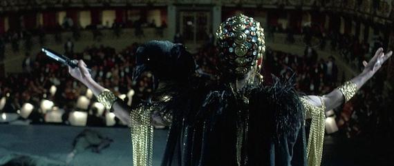 The opening scene is iconic. Argento starts with an extreme close up of the raven’s eye, reflecting the theater from the point of view of the stage. The raven squawks incessantly, disrupting the performance of the lead soprano. He utilizes long takes to transport audiences throughout the theater, as though we are creeping the corridors and spying on the events ourselves. It creates an intimacy with the theater company and its characters, and feel almost as though we are in the position of the perpetrator as he works his way through his victims.