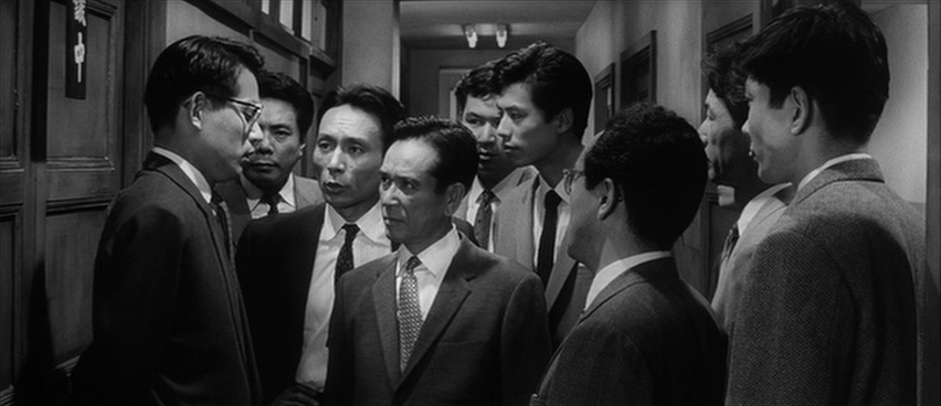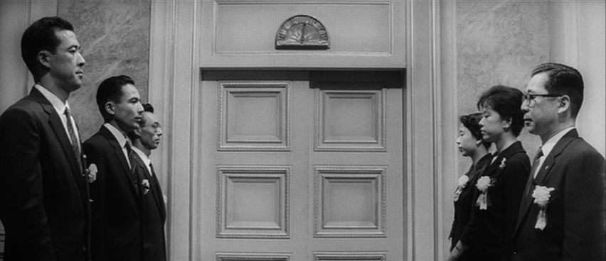The ceremony was hosted by the revered Public Development Corporation’s Vice President Iwabuchi (Masayuki Mori) whose daughter Yoshiko (Kyōko Kagawa) weds his secretary Koichi Nishi (frequent colloborater and star of many Kurosawa films, Toshiro Mifune). Yoshiko is a naïve and kind-hearted young woman, who suffers from a disability from a childhood incident. Because of this, many question the sincerity of Nishi’s intentions, but he has established a trusting relationship with her protective older brother, Tatsuo (Tatsuya Mihashi), and has worked his way into her heart. If that were not enough to get stir the pot, the company has been under scrutiny over a recent merger with Dairyu Construction Company, and the police crash the event to arrest corporate assistant officer Wada (Kamatari Fujiwara) on charges of bribery. Through the chatter of the onlooking reporters, the audience learns that the events are reminiscent of an earlier scandal involving Iwabuchi, his administrative officer Moriyama (Takashi Shimura) and contract officer Shirai (Kō Nishimura) – the scandal that had resulted in the convenient death of Faruya, putting a dead end to the investigations.