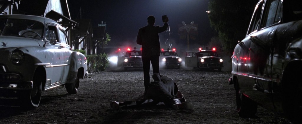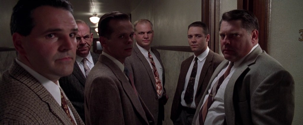 This film introduces two relatively unknown actors in North America at the time, Russell Crowe and Guy Pearce, but was stacked with popular backing castmates Kim Basinger, Kevin Spacey and Danny DeVito. We first meet LAPD Sergeant Edmund “Ed” Exley (Pearce), who is an upstanding officer, determined to nobly fill his fathers shoes who was an esteemed officer killed in the line of duty by an unknown assailant who goes by the name “Rollo Tomasi.” However, his pursuit of righteousness is not quick to make him friends: his first order is to testify against a slew of other officers in a case dubbed the “Bloody Christmas” in exchange for a promotion to Detective Lieutenant, against the advice of precinct captain Dudley Smith (James Cromwell). Leading the group of Exley haters is Officer Wendell “Bud” White (Crowe), undercover cop who devotes the majority of his time to mercilessly reprimanding women beaters, an outcome of a childhood trauma.