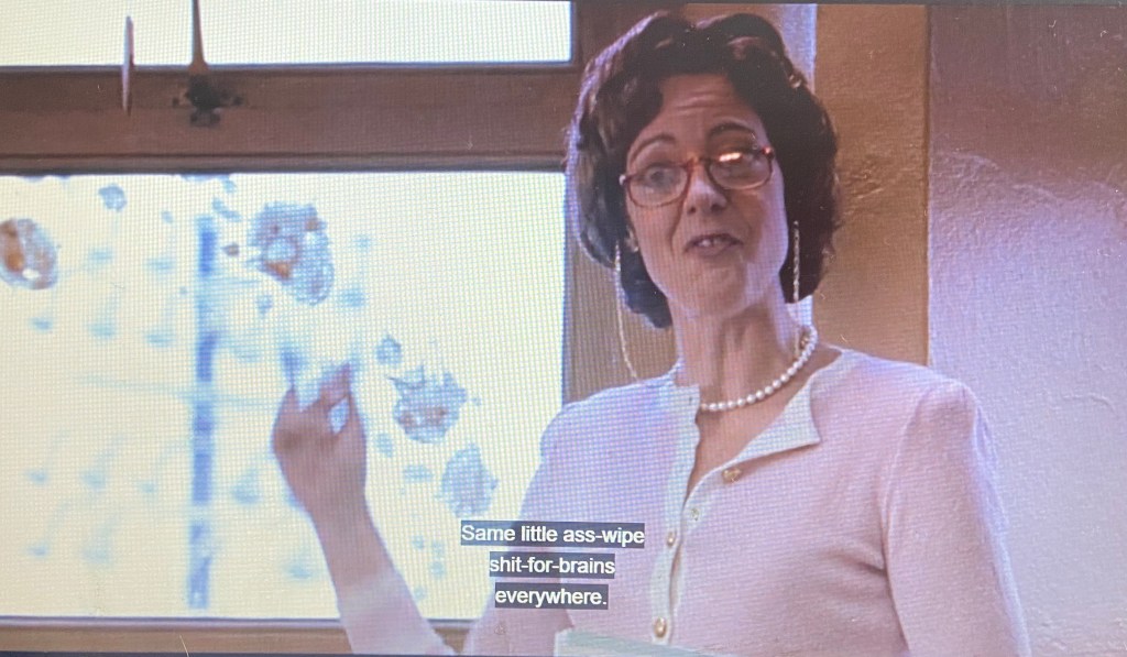 “She’s a mutant!” - Allison Janney. Her character here is hilarious. It can be seen as problematic for a few reasons: at best, it is ageist that the woman who is older than 30 is written as desperate and horny; at worst, highly inappropriate that she is a high school counselor and takes a long look at 17 year old students package… “Bratwurst… aren’t we the optimist?” However, it is worth noting that the character was likely not written to be either of those things with malintent. It is comical that a schools counselor who is surrounded by young peoples raging hormones and is stuck in an office all day, spends all of her time typing up an explicit romantic novel. The entire concept is unique and Allison Janney is hilarious, so her performance here is incredibly memorable. I am constantly thinking about the line: “Same little ass wipe shit for brains everywhere” while she flips the bird out the window.